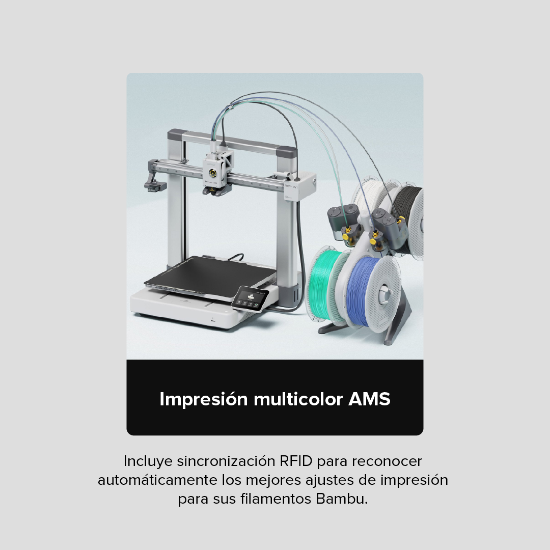 - Tecnología de Cambio Automático de Material (AMS): Cambia filamentos de manera automática, perfecta para proyectos que requieren múltiples colores y materiales.